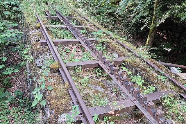 | Commentaire image : L'écartement de la voie, vue à proximité de la station inférieure, est de 1,435 m. Une rame de TGV pourrait donc assurer le service. | ![]() |