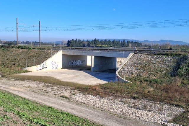 | Commentaire photo - Au loin, vers l'est, la ligne de crête des Alpilles ondule au-dessus de la plaine provençale. | |