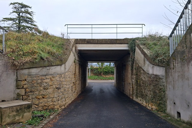 | Commentaire photo - Le passage sous voie a été prolongé côté impair pour supporter une longue voie de tiroir - à présent déposée - issue de la gare de Bagnols sur Cèze. Au premier plan, à gauche et à droite, les culées en béton du pont de la mini-rocade. La direction de Nîmes est à droite. | |