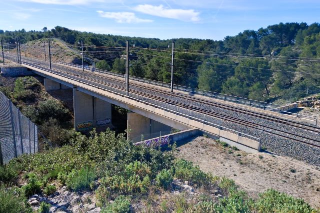 | Commentaire photo - Comme on l'entrevoit à gauche, la partie basse du grillage de protection de la LGV a du être renforcée, moins pour la préserver des tagueurs que du gros gibier - encore qu'on puisse qualifier les premiers de gibiers de potence. La photo est prise en direction de Marseille. | |