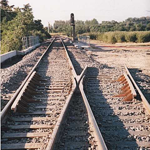 photo - Le photographe regarde en direction de Pertuis. En-deçà du pont-rail, l'aiguille préfigure le raccordement vers la LGV Méditerranée. Au-delà du pont-rail, l'aiguille anticipe l'accès à la base-travaux de ladite LGV Méditerranée. |