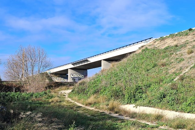 | Observations - Cet ouvrage, réalisé à partir de 2017, relie la rocade routière contournant la ville d'Arles au Site Industrialo-Portuaire de la Compagnie Nationale du Rhône. Le fer y tire son épingle du jeu : en 2025, le Groupe Combronde y expédiait des trains de containers vers Bordeaux et Lille. | |