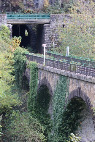 | Commentaire photo - La lèpre végétale, maîtresse des piliers, s'attaque désormais aux tympans. Au-delà du tablier du pont-route, on aperçoit l'entrée du souterrain, et même sa sortie côté Noirétable. | |