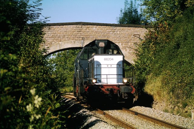 | Commentaire photo - Avec son parapet intégré à deux pentes, cet ouvrage pourrait faire penser à un pont antique ou médiéval. Ce couplage de BB 66000, en route vers Brive, se laisse glisser vers la Dordogne. | |