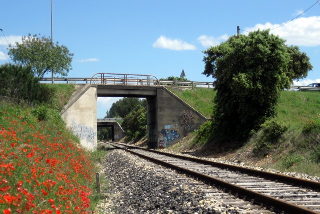 | Commentaire photo - Si les gentils coquelicots nouveaux ont inspiré les impressionnistes, les dérivés de certains autres pavots ôtent tout talent à leurs successeurs, les tagueurs. Au second plan, le pont sous l'autoroute donne la direction de Carpentras. | |
