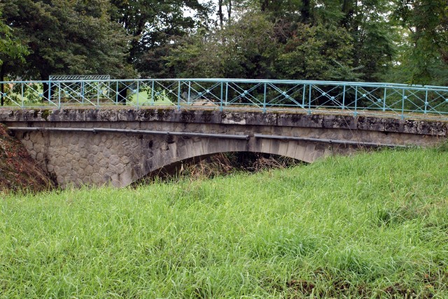 Commentaire photo - A y regarder de près, la goulotte qui enlaidit cet ouvrage a plus mal vieilli que son support, égayé par la riante peinture bleue de son garde-corps. | |