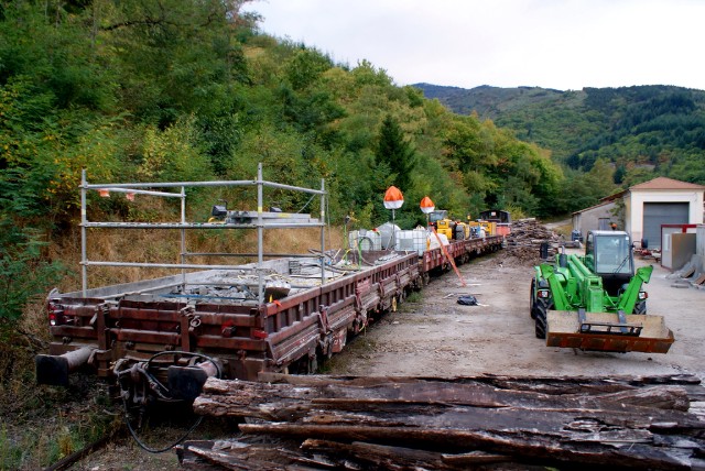 | Commentaire photo - L'ancienne remise de Villefort, que l'on apercoit à l'extrême droite, n'est qu'un prétexte pour donner un aperçu des menus travaux exécutés sur la ligne des Cévennes à l'automne 2009, opérations uniquement destinées à surseoir à la fermeture de la section montagneuse, nullement à en pérenniser l'exploitation et encore moins à l'améliorer. La rame en stationnement gagne en soirée, vers Alès, le tunnel de Valcrousès, dont les parois font l'objet de projections de béton. | |