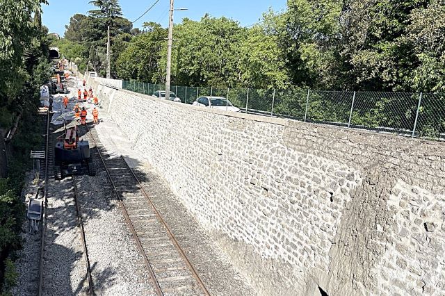 | Commentaire photo - Année après année, les travaux se poursuivent entre Clermont Ferrand et Nîmes. En avril 2026, c'était au tour des tranchées au nord de Nîmes d'être confortées, entraînant une désormais habituelle suspension du trafic. On aperçoit, tout au fond, en direction d'Alès, le tunnel de la Tour Magne. | |