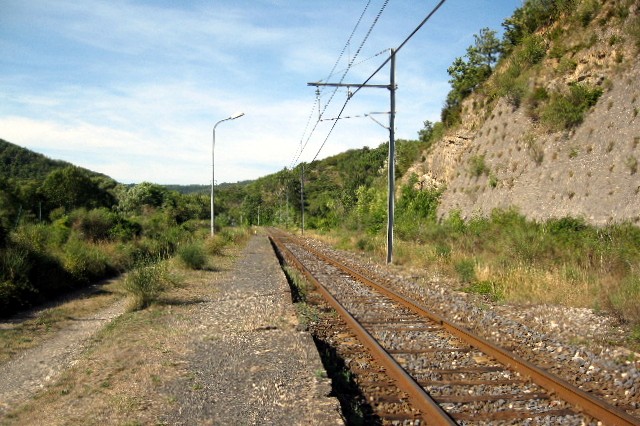 Commentaire photo - Le mur de soutènement des Cabrils fait face au quai central, toujours opérationnel, malgré les apparence : en 2015, jusqu'à quatre TER quotidiens - tous sens confondus - y marquent encore l'arrêt. En principe, et malgré l'isolement de ce vallon perdu. | |