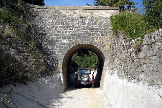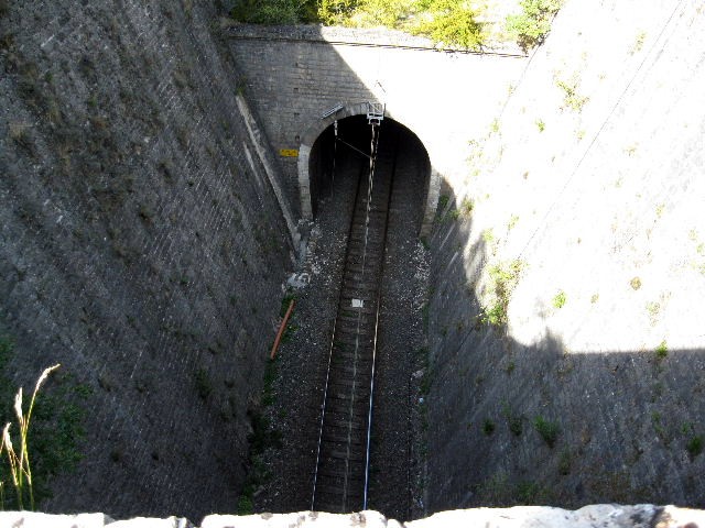 Commentaire photo - Une courte mais prodigieuse tranchée sépare les deux tunnels des Cabrils. Le portail sud du n° 2 est vu depuis le haut mur s'appuyant sur le portail nord du n° 1. | |