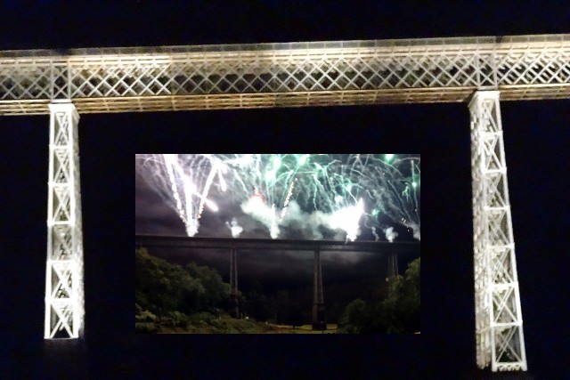 | Commentaire image - Pour les 150 ans du viaduc de Busseau sur Creuse, l'association locale "Histoire et Patrimoine" avait fait les choses en grand : rassemblement de trains historiques et embrasement de l'ouvrage la nuit venue. On attend désormais avec impatience le bicentenaire. | ![]() |