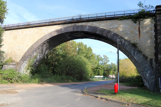 Commentaire image - La dernière des cinq arches du viaduc sur l'Allier franchit le chemin des Palisses, qui conduit à la plage de Pont du Château. A noter que c'est le viaduc sur la Dore qui constitue le point le plus bas de la ligne. Quatre repères de nivellement : 323,632 m, 309,375 m, 312,192 m et 324,634 m. |