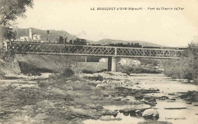 Commentaire photo - Le tablier à croisillons, près duquel le comédien Michel Galabru a passé son enfance, semble supporter, à gauche, le quartier et l'église de Saint Martin d'Orb, auxquels la montagne de Méguillou sert de toile de fond. La direction de Neussargues est à droite. Le cliché date des années 1905. | |