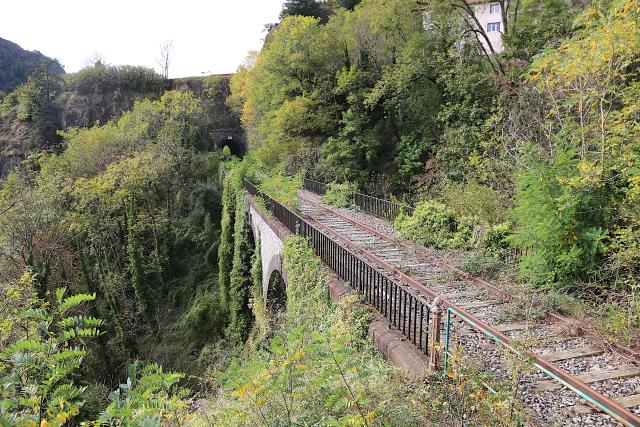 | Commentaire photo - Sur les arches de l'ouvrage, lierre et pierre se livrent un combat sans merci. Au fond, le tunnel de Granetias donne la direction de la gare de Thiers. | |